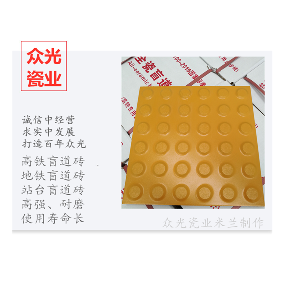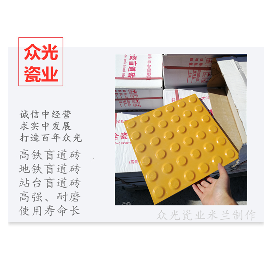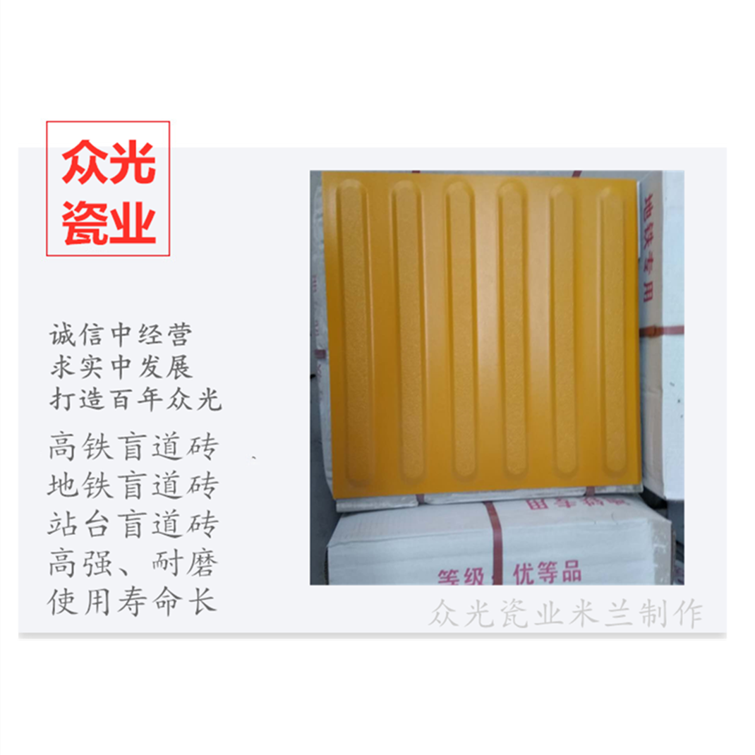 全瓷盲道磚生產(chǎn)廠家,焦作市眾光耐酸瓷業(yè)有限公司生產(chǎn)全瓷盲道磚,中黃盲道磚,耐磨,防滑,抗沖擊,色澤光鮮亮麗,適用于車站站臺(tái)