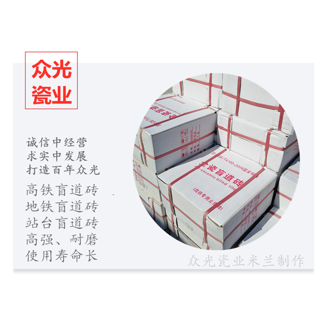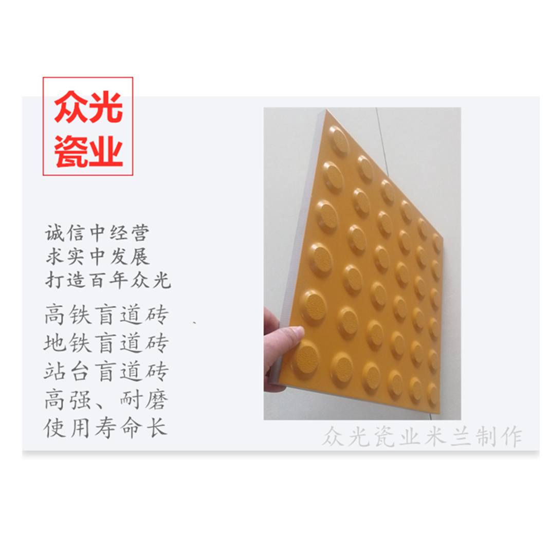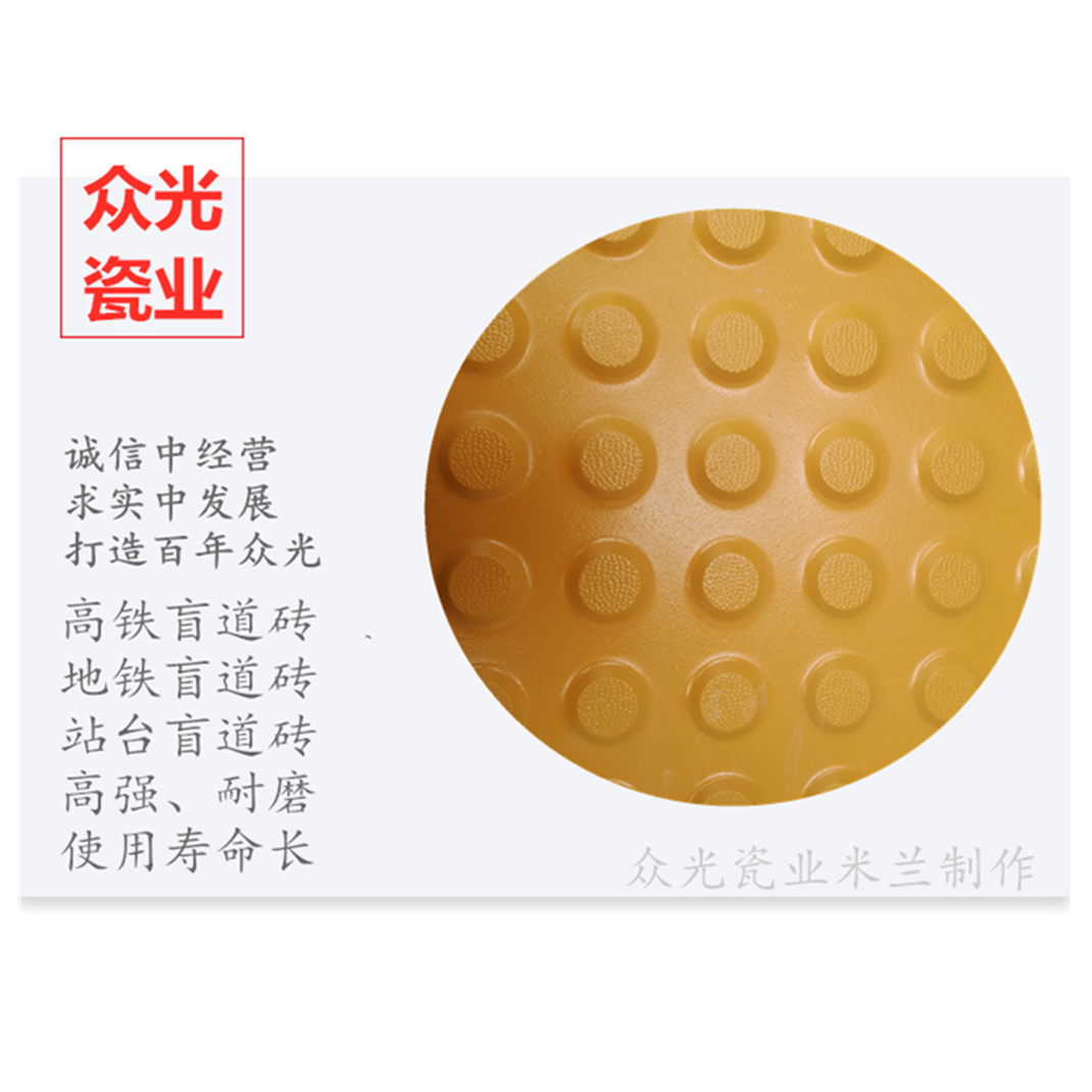 全瓷盲道磚生產(chǎn)廠家,焦作市眾光耐酸瓷業(yè)有限公司生產(chǎn)全瓷盲道磚,中黃盲道磚,耐磨,防滑,抗沖擊,色澤光鮮亮麗,適用于車站站臺(tái)